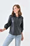 Kadın Deri Gömlek Kol Ucu Lastikli Düğmeli Cepsiz Deri Gömlek Pudra - 10059