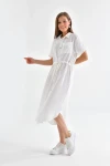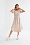 YAKALI BOYDAN DÜĞMELİKISA KOLLU CEPL, ASTARSIZ YIRTMAÇLI DİZ ALTI ELBİSE