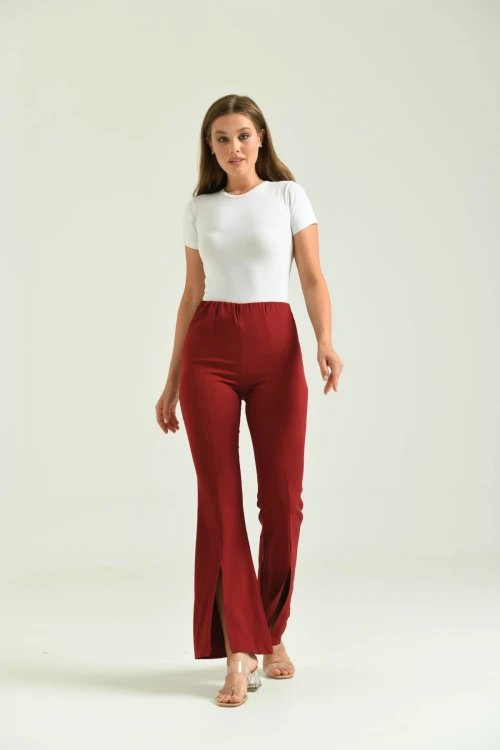 Kadın Pantolon Paça Detaylı Toparlayıcı Yüksel Bel Kumaş Pantolon Bordo - T111
