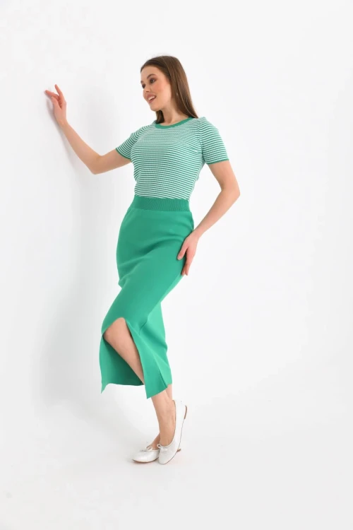 Kadın Etek Bel Lastikli Ön Yırtmaçlı Maksi Boy Düz Etek Bebe Yeşili - 10049