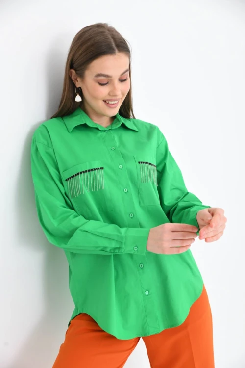 Kadın Yeşil Cep Zincir Süslemeli Çift Cep Detaylı Gömlek