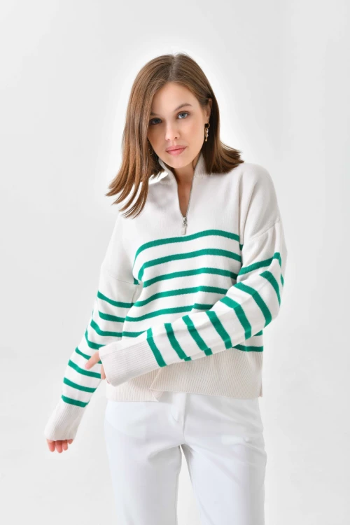 YAKALI FERMUARLI ÇİZGİLİ DESENLİ KAZAK