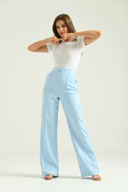 Kadın Pantolon Geniş Paça Likralı Cepli Düğmeli Kadın Pantolon Mavi - T019