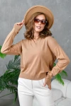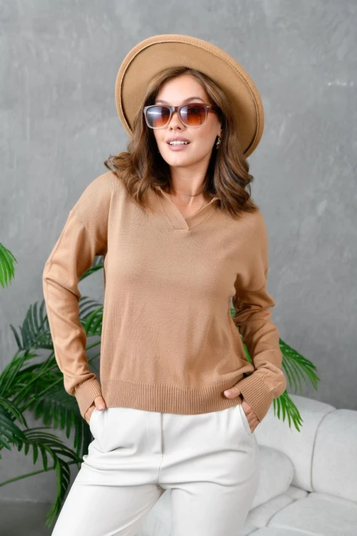 KADIN CAMEL V YAKALI KOL VE BEL LASTİKLİ TEK RENK KAZAK