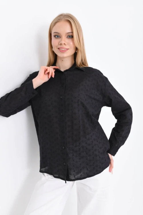 Motifli Kadın Gömlek Delikli Desen Klasik Kadın Gömlek Siyah - 23081