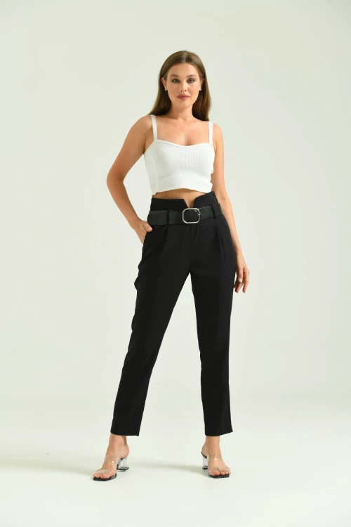 Kadın Pantolon Yüksel Bel Kemer Detay Havuç Pantolon Siyah - T016