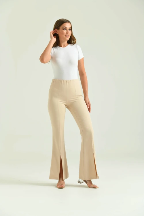 Kadın Pantolon Paça Detaylı Toparlayıcı Yüksel Bel Kumaş Pantolon Taş - T111