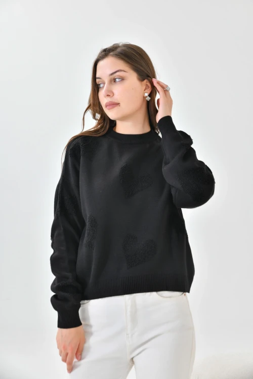 BİSİKLET YAKA TEK RENK KALP DESENLİ KAZAK
