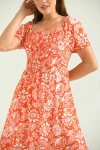 YAKA KOL VE BEL LASTİK BÜZGÜLÜ KISA KOLLU KARE YAKA UZUN ELBİSE
