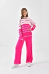 UZUN KOLLU BİSİKLET YAKA ÇİFT RENKLİ ÇİZGİLİ YANLARDAN YIRTMAÇLI TEK RENK PANTOLONLU UZUN MODEL BEL LASTİKLİ TAKIM