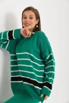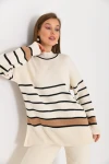 YÜKSEK BOYUNLU ÇİFT RENK BEL YIRTMAÇLI ÇİZGİLİ DÜZ RENK PANTOLONLU TAKIM