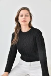 Kadın Kazak Örme Desen Detaylı Bel Boy Bisiklet Yaka Kazak Siyah - 6006