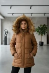 Kadın Çıkarılabilen Kürklü Kapşonlu Taba Şişme Mont M011