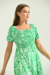 T097 NAR YAKA KOL VE BEL LASTİK BÜZGÜLÜ KISA KOLLU KARE YAKA UZUN ELBİSE