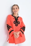 Kadın Bluz Desenli V Yaka Bağlamalı Kadın Bluz Nar - 23100